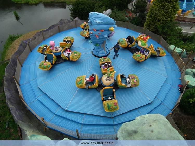de kwal een huss enterprise met een leuk water thema van lol atol een draait best veel rondjes voor een pretpark 12 rondjes op de top